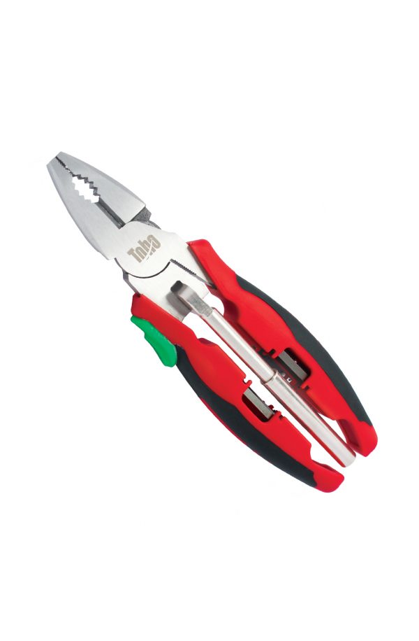The Toho Multifunction Plier is forged from hardened and tempered chrome vanadium steel of 35-50 HRC for strength and durability. Heavy duty comfortable TPR handle for working long period. Spring closed for safety after working. Less effort required during applications. Satin nickel finish on surface for rust protection. Induction Hardened cutting edges of 58-60 HRC for the ultimate performance. Adjustable spring, open state, easy to operate. 4 screwdriver bits stored in the handle which fit the bit-driver. An additional shank to support screw driving activities.
